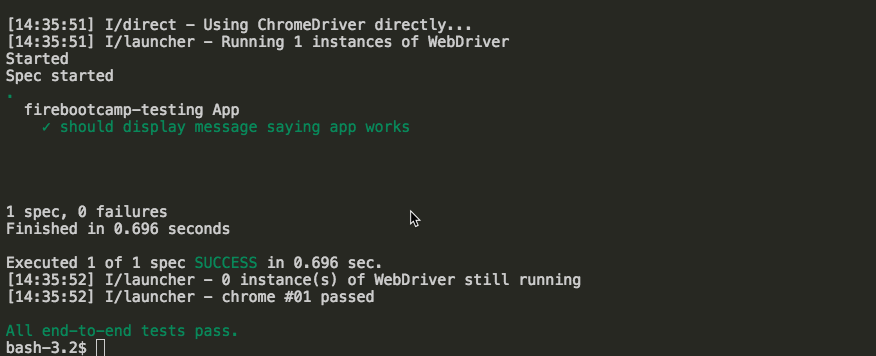 - Run the default e2e tests in e2e/app.e2e-spec.ts with the following command which will run all e2e tests in the e2e folder in a file ending in .e2e-spec.ts
