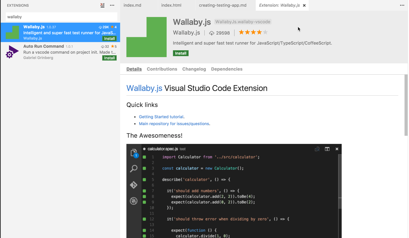 To install WallabyJS first, you need to get a trial version of the extension from the extension window in VSCode