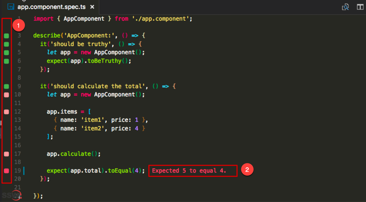 - Run the default unit tests in src/app/app.component.spec.ts with the following command which will run all tests in the app folder in a file ending in .spec.ts
